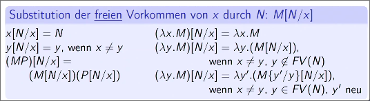 where means substituting the term for each free occurrence of in . If there are free variables in then bound variables in must be renamed so that substitution does not result in the free variables in becoming bound. This process of renaming bound variables is called alpha reduction.