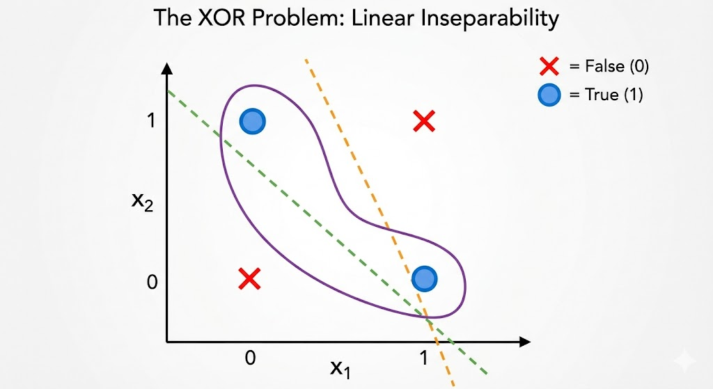 A simple linear model fails on complex, non-linear data, such as separating XOR data points.